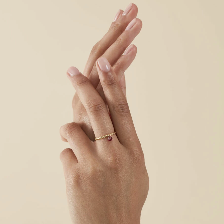 Bague, en argent véritable doré 750/1000, avec un fil torsadé, sur lequel un oxyde de zirconium perçé et en forme de cœur, est en pampille