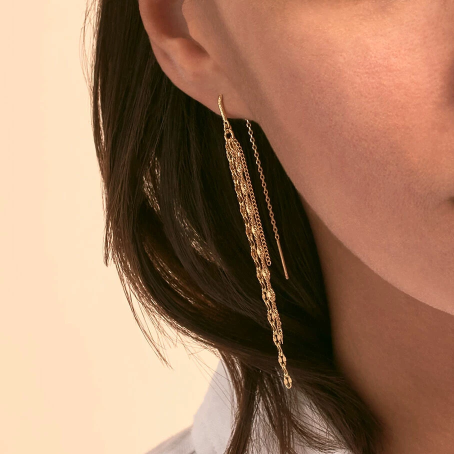 Boucles d’oreilles mi-longues, en laiton doré 750/1000, faites d’un pompom de 6 chaines de différentes longueurs