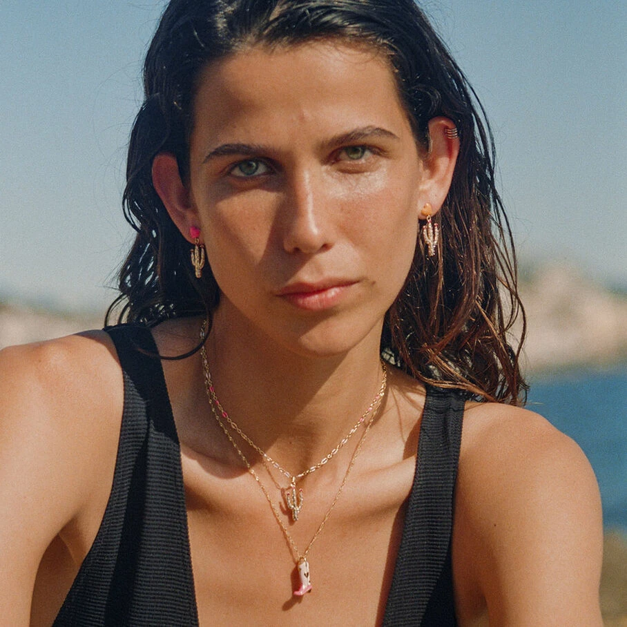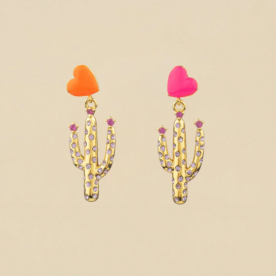 Boucles d’oreilles mi-longues, en laiton doré 750/1000, coeur émaillé et cactus avec 3 oxydes de zirconium