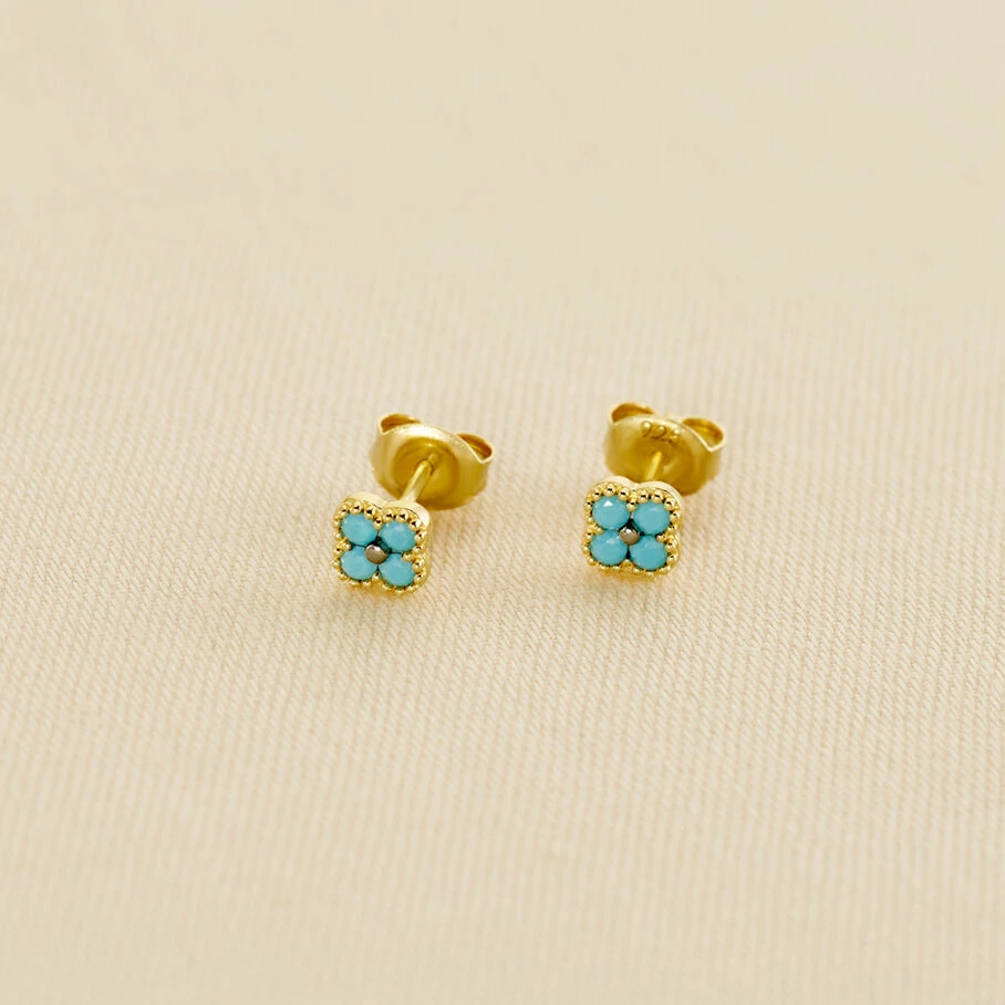 Boucles d’oreilles puces, en argent véritable finement doré 750/1000, en forme de fleur; dont les pétales sont pavés d’oxyde de zirconium et le pourtour réalisé avec un fin graineti