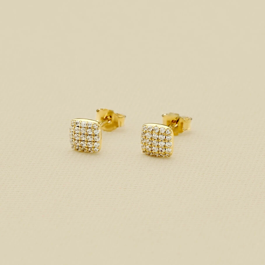 Boucles d’oreilles puces, en argent véritable doré 750/1000, en forme de coussin et serti d’oxydes de zirconium