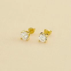 Boucles d’oreilles puces, en argent véritable et dorées 750/1000, ornées d’oxydes de zirconium griffés de 6 mm