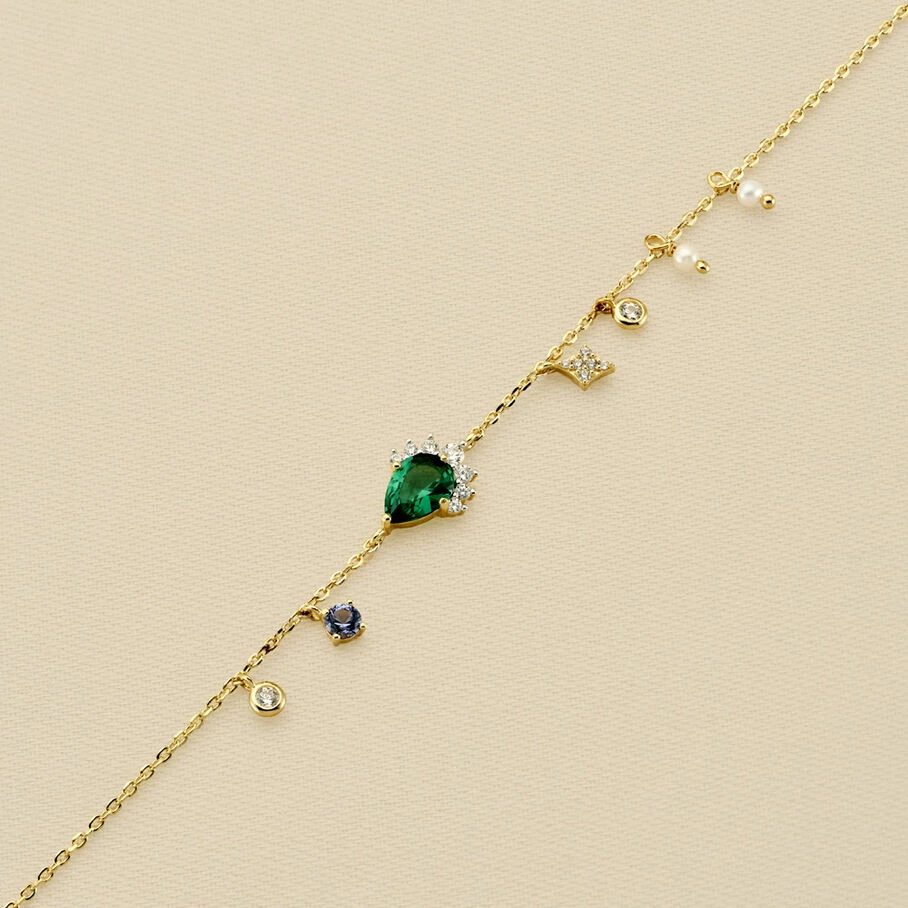 Bracelet chaine, en argent véritable doré 750/1000, avec un oxyde de zirconium en forme de goutte, monté d’une couronne d’oxydes de zirconium. Les pampilles d’oxydes de zirconium et de perles donnent de la modernité à ce bijou si proche de la joaillerie de par son style