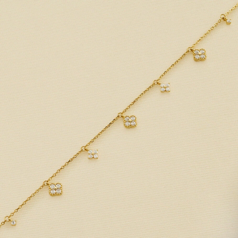 Bracelet chaine, en argent véritable doré 750/1000, avec des fleurs d’oxydes de zirconium en pampille et un fin graineti sur le pourtour