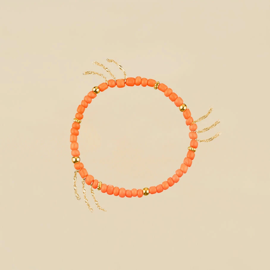 Bracelet elastique, en laiton doré 750/1000, perles de verre enfilées et pompons de chaines