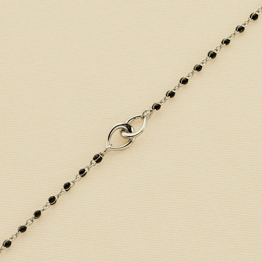 Bracelet, en laiton rhodié, perles d’émail sur chaine et deux anneaux gouttes entrelacés