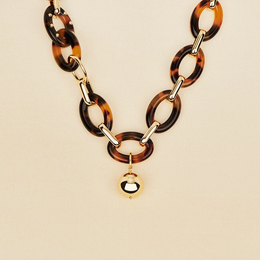 Collier mi-long en laiton doré 750/1000, maillons ovales en acetate et boule métal en pampille, fermoir T-bar.Ces chaines amovibles offrent un multiporté : en coller mi long, en collier Y ou en collier court assorti d’un bracelet.