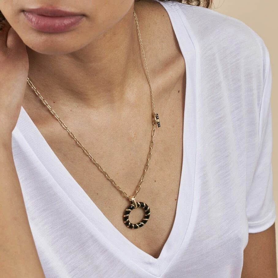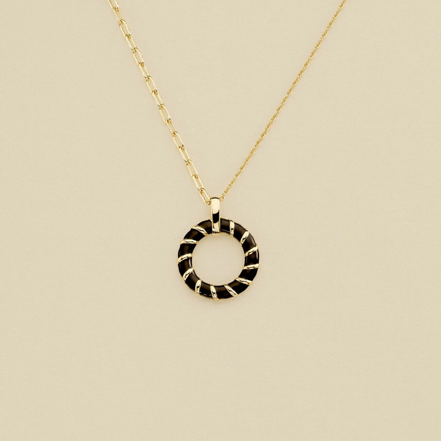 Collier mi long, en laiton doré, chaine torsade et rectangle, pendentif anneau avec un effet torsadé en émail