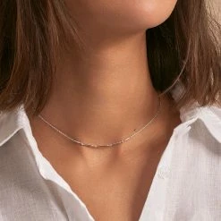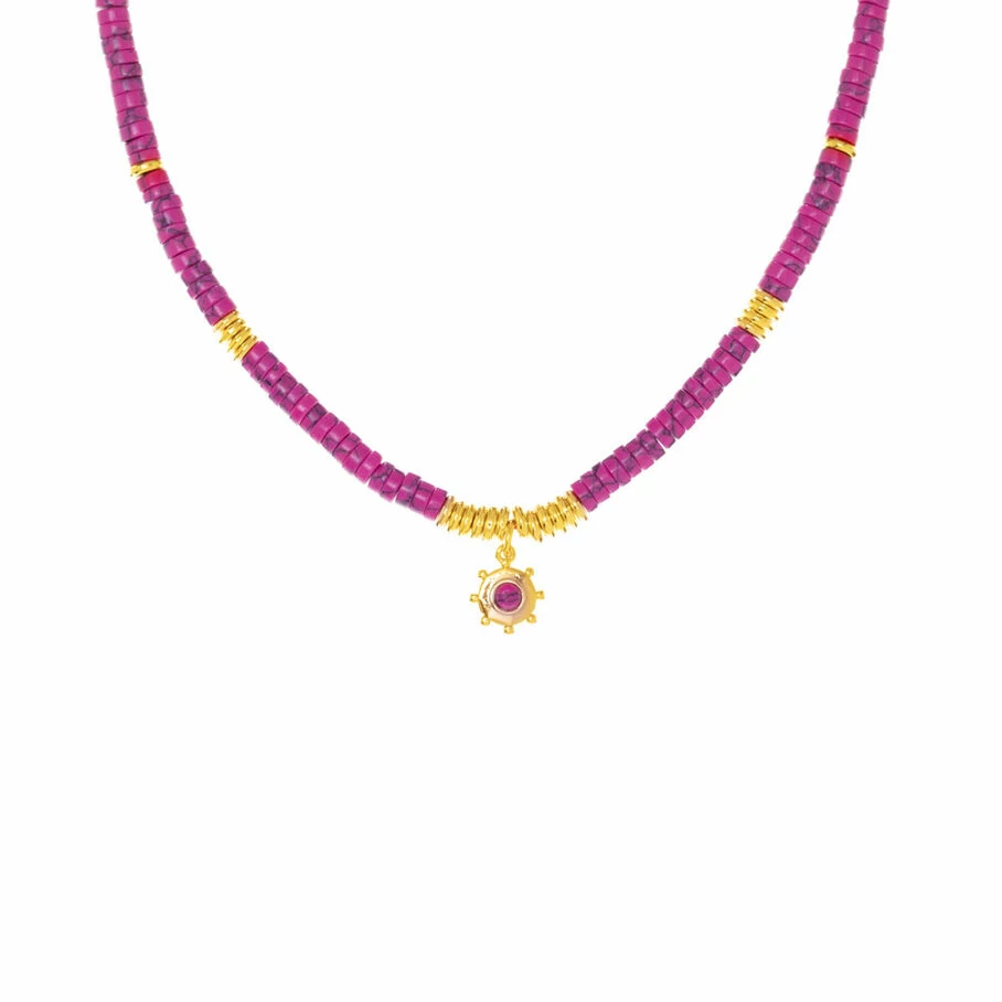 Collier court en laiton doré 750/1000 avec des perles heishi et une pampille ‘soleil’ ornée d’un cabochon de pierre fine
