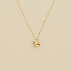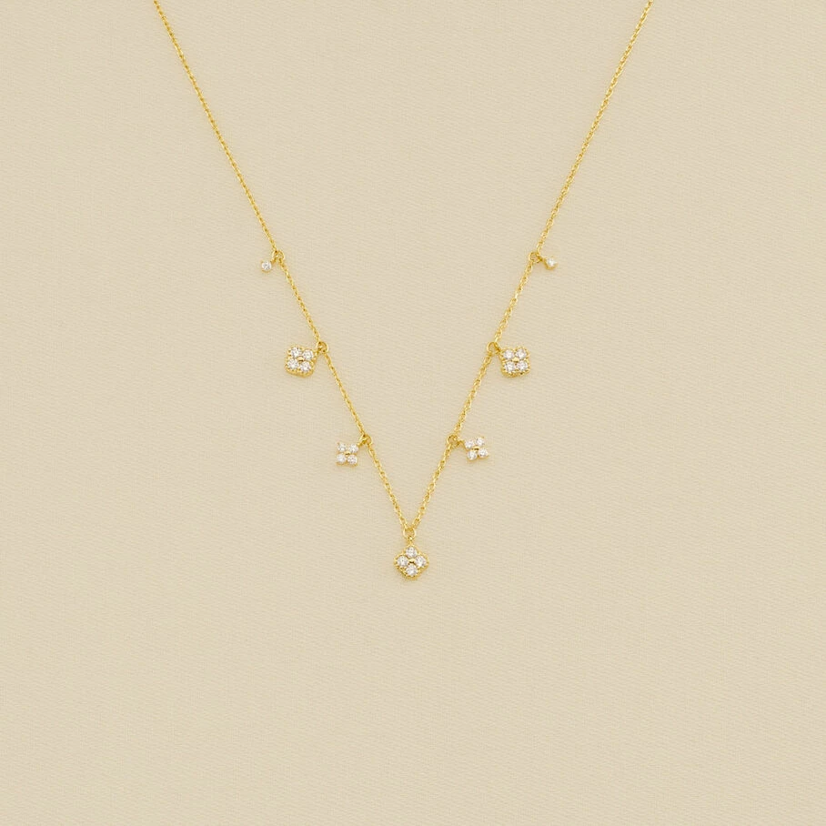 Collier court, en argent véritable doré 750/1000, avec des fleurs d’oxydes de zirconium en pampille et un fin graineti sur le pourtour