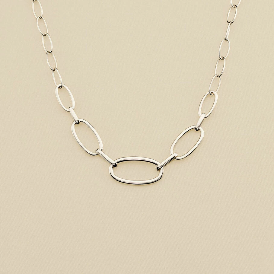 Collier maillons ovales allongés de différentes tailles, dégradé sur le devant, et notre fermoir T identitaire
