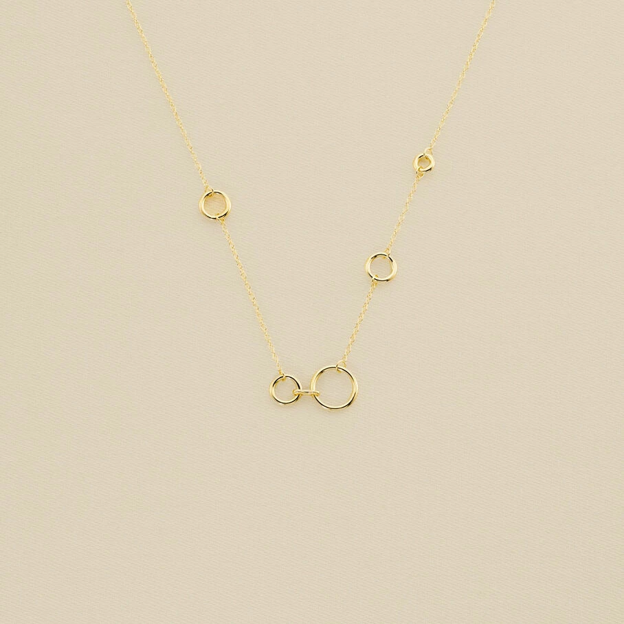 Collier court, en argent véritable doré 750/1000, avec une fine chaîne sur laquelle sont montés des anneaux évidés de différentes tailles