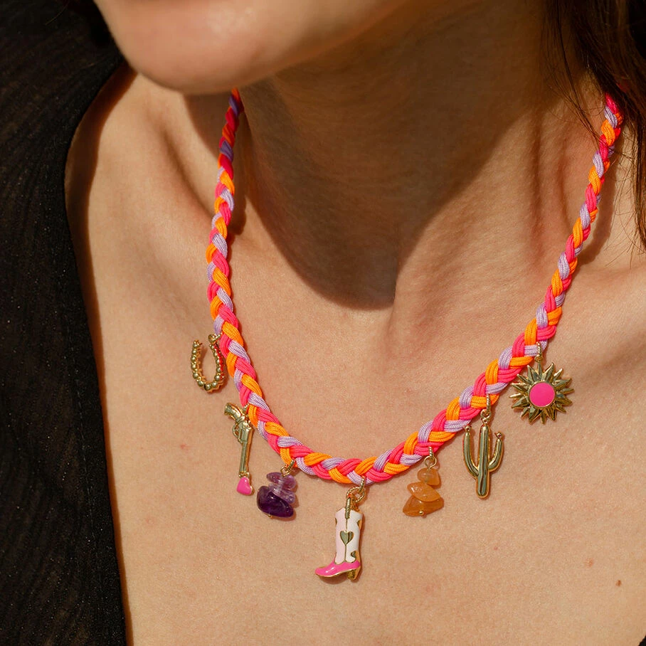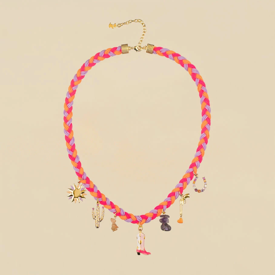 Collier court, en laiton doré 750/1000, tresse avec plusieurs pendentifs faisant référence à l’univers du Western (bottes, pistolet, cactus, soleil, fer à cheval et pierres), dont certains sont émaillés ou pavés d’oxydes de zirconium