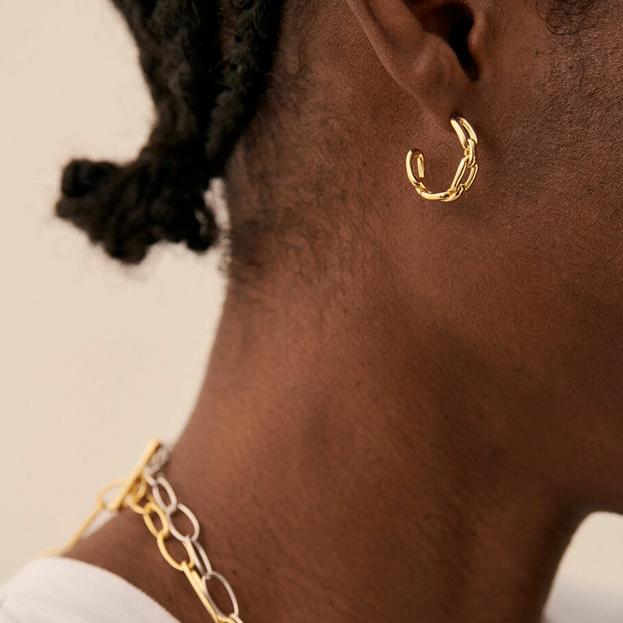 Créoles de 20mm de diamètre en laiton plaqué à l’or fin formée d’une maille rectangulaire rigide