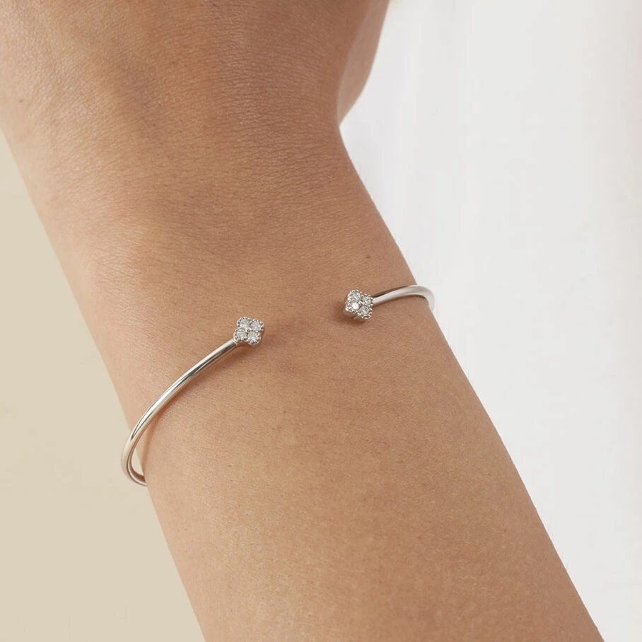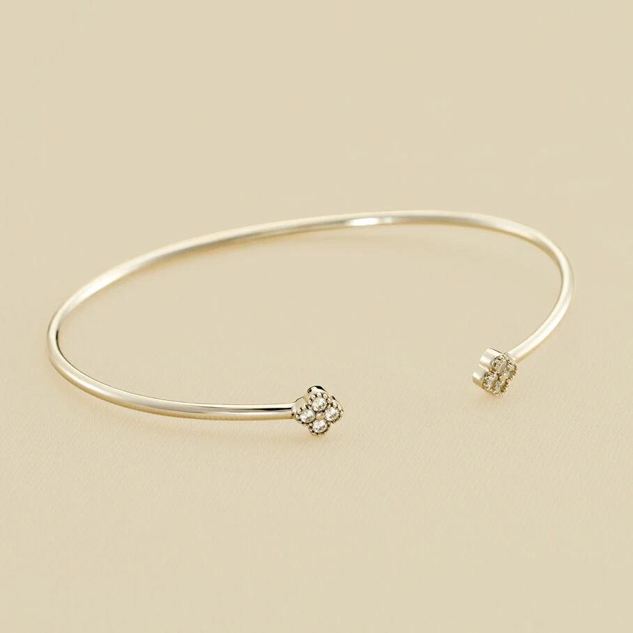 Jonc fin ouvert, en argent véritable, avec des fleurs d’oxydes de zirconium aux extrémités et un fin graineti sur le pourtour