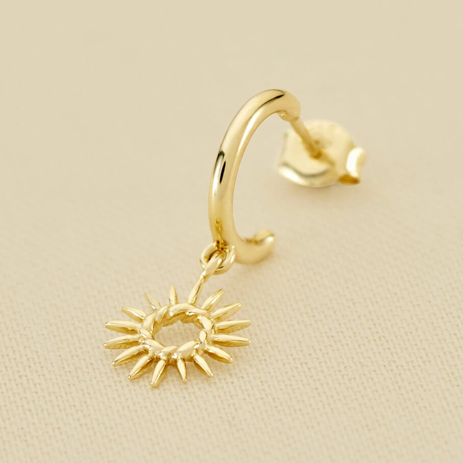 Boucle d’oreille créole à l’unité, en argent 925/1000 doré 750/1000, reprtésentant un soleil radieux. Le soleil évidé au centre permets d’obtenir brillance et légèreté à la pièce !