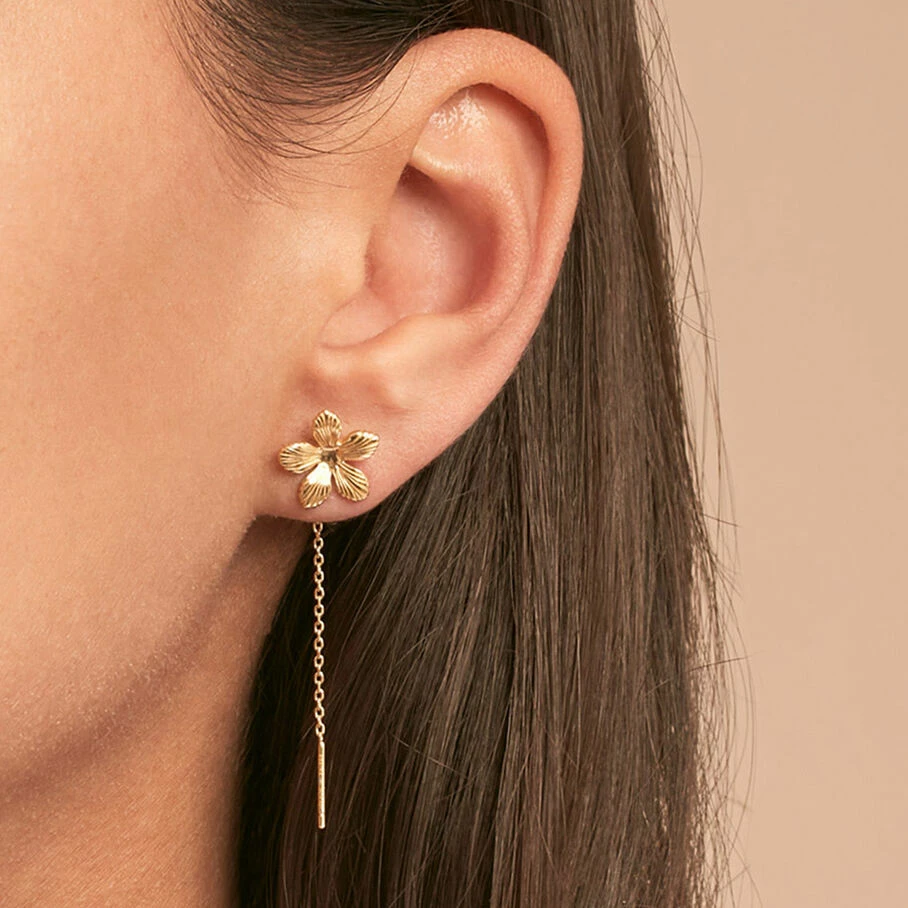 Boucle d’oreille pull trough, fleur sur le devant et chaine longue à l’arrière de l’oreille, en argent doré 750/1000. A l’unité, pour mieux les mixer et les accumuler.
