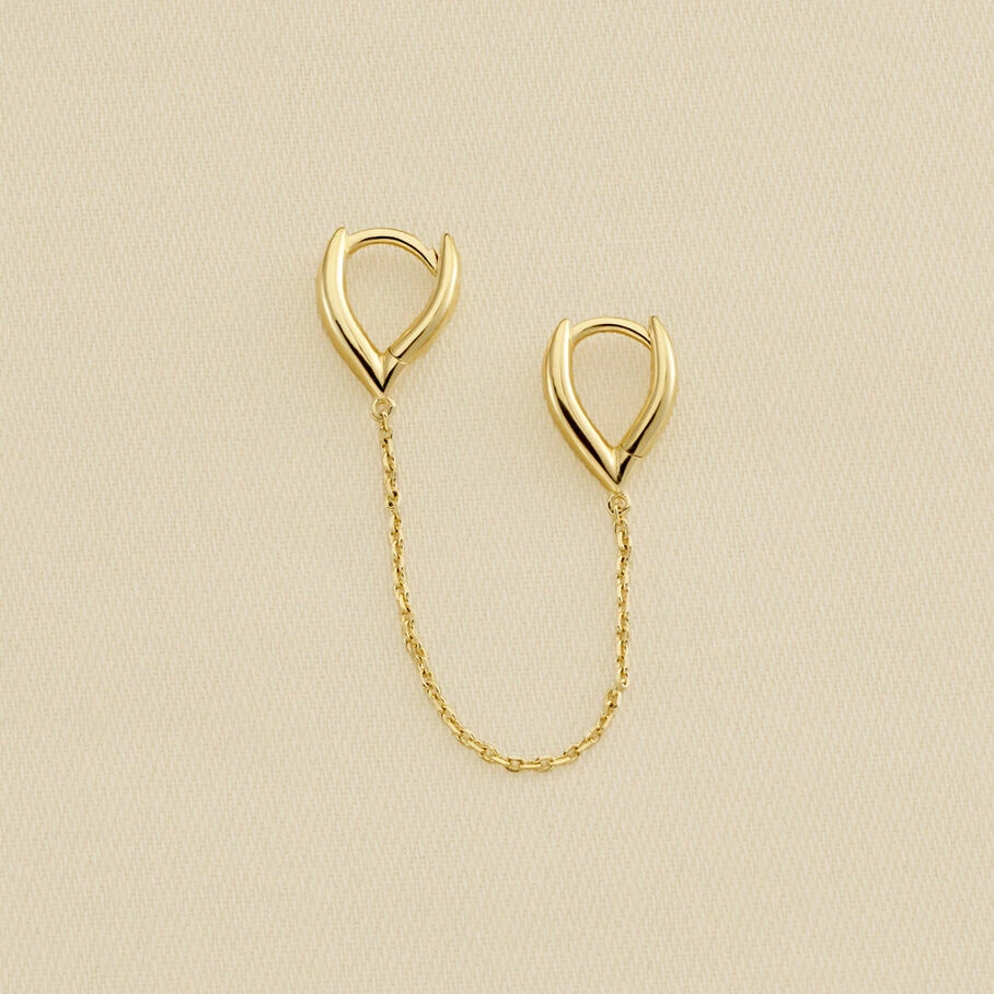 Boucle d’oreille double puces à l’unité, en argent 925/1000 et dorées 750/1000, représentant deux goutte inversée. Les deux créoles sont reliées par une délicate chaine de la même matière.