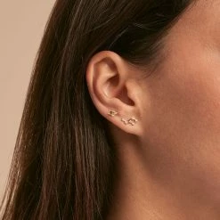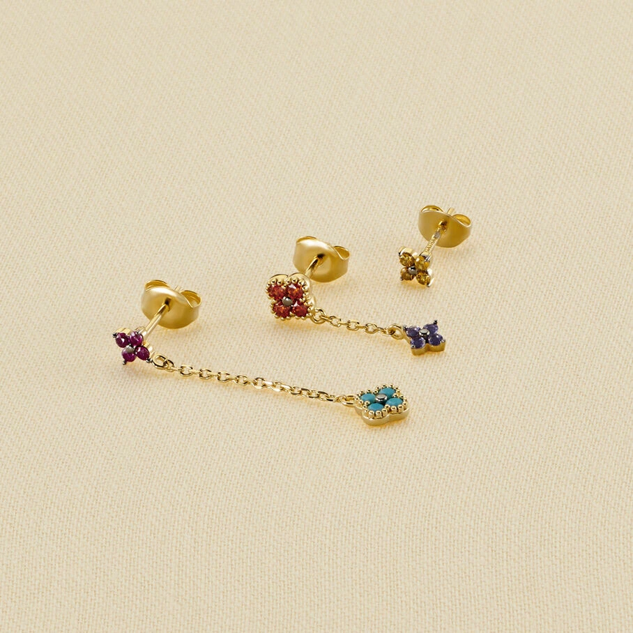 Set de 3 boucles d’oreilles, en argent véritable doré 750/1000, de trois différentes longueurs, avec des fleurs d’oxydes de zirconium et d’un fin graineti sur le pourtour