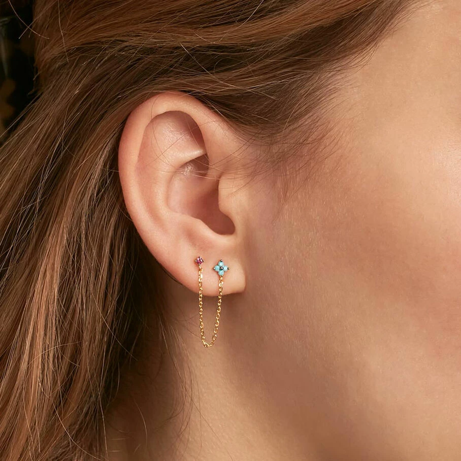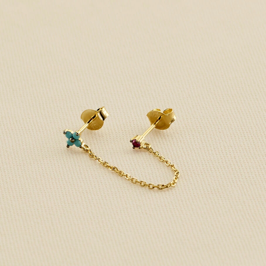 Boucle d’oreille double puces à l’unité, en argent 925/1000 et dorée 750/1000, réprésentant deux fleurs pavées d’oxydes de zirconium colorés. Les deux puces sont reliées par une délicate chaine de la même matière.