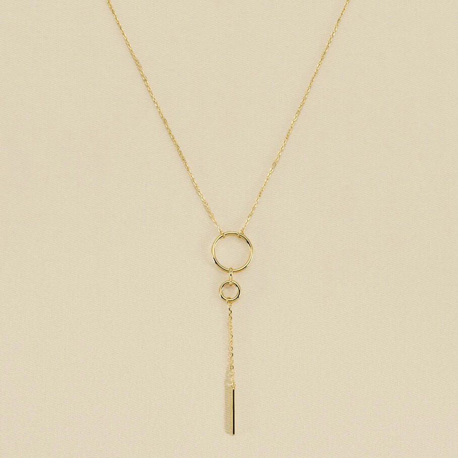 Collier Y, en argent véritable doré 750/1000, avec une fine chaîne sur laquelle sont montés deux anneaux évidés de différentes tailles